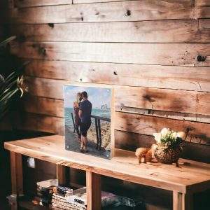 בלוק עץ טבעי המשולב עם זכוכית אקרילית שקופה. בין העץ לזכוכית ממוקמת התמונה שלכם, מודפסת באיכות גבוהה