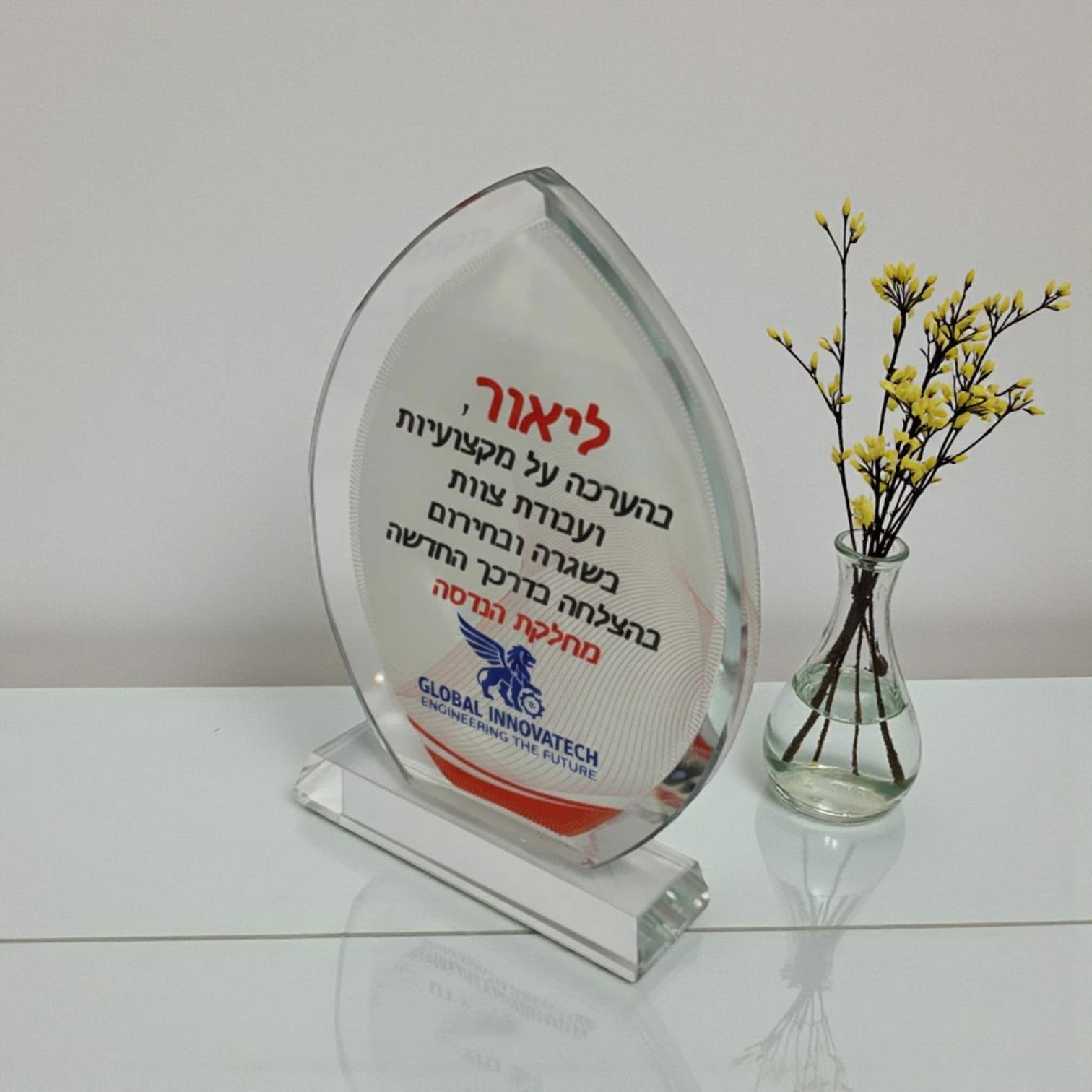 מגן הוקרה זכוכית קריסטל - מודרני ואיכותי דגם יהלום ממש יהלום!מגן הוקרה מזכוכית קריסטל דגם יהלום רחב הוא מוצר מדהים המשלב בתוכו עיצוב מודרני ואיכות גבוהה.המגן המודפס מעניק לך את האפשרות להוציא לאור את ההוקרה שלך לאנשים המיוחדים בחייך,והוא מושלם לכל מטרה ואירוע.המגן המודפס על גבי זכוכית קריסטלית ואיכותית עם מראה תלת מימד ותופס את הבמה בכל מקום שיונח.בגודלו המדויק של 21X15 ס"מ, המגן מודפס בטכנולוגיית הדפסה איכותית המבטיחה תוצאות מדהימות וצבעים עמידים לאורך זמן.שלחו לנו את הכיתוב והסקיצה ותשלח אליכם לאישור והמגן ישלח אליכם תוך 3-4 ימי עסקים עם קופסה מהודרת.באם תבחרו לאסוף יש להתקשר ונוציא לכם לאוטו.