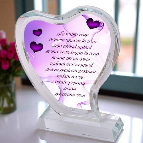 מתנה מושלמת מהלב! 💝 בלוק קריסטל מרשים בצורת לב, בגודל 16X18 ס"מ, המגיע עם מארז יוקרתי. זוהי מתנה אידיאלית להוקרה, להערכה או פשוט כדי להנציח רגעים מיוחדים באהבה. הערות להדפסה: הדפסה ישירה על הזכוכית, איכותית ועמידה לאורך זמן. לקולאז' תמונות, יש לשלוח לנו את התמונות לאישור לפני ההדפסה. נשלח לכם סקיצה בשמחה! משלוח ואיסוף: משלוח: תוך 3 ימי עסקים. 🚚 איסוף עצמי: התקשרו אלינו למספר 050-2877977 ונוציא לכם את ההזמנה עד לרכב. 🚗