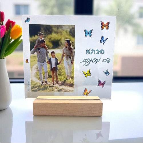 מסגרת לד מוארת עם תמונה וחריטה לסבתא המפנקת המסגרת עשויה לוח זכוכית אקרילית בשקיפות גבוהה חיתוך בלייזר הממוקם על בסיס עץ איכותי עם תאורת לד חזקה שמחוברת לכבל באורך 1.5 מ' עם מפסק ועם חיבור USB. המסגרת מתאימה לתמונת רוחב גודל 10X15 אולם אם ברשותכם רק תמונות אורך וניתן יהיה להפוך את התמונה לרוחב על חשבון חיתוך התמונה. מידת המסגרת 18X24 ס"מ והיא מתאימה למעמד בלבד.