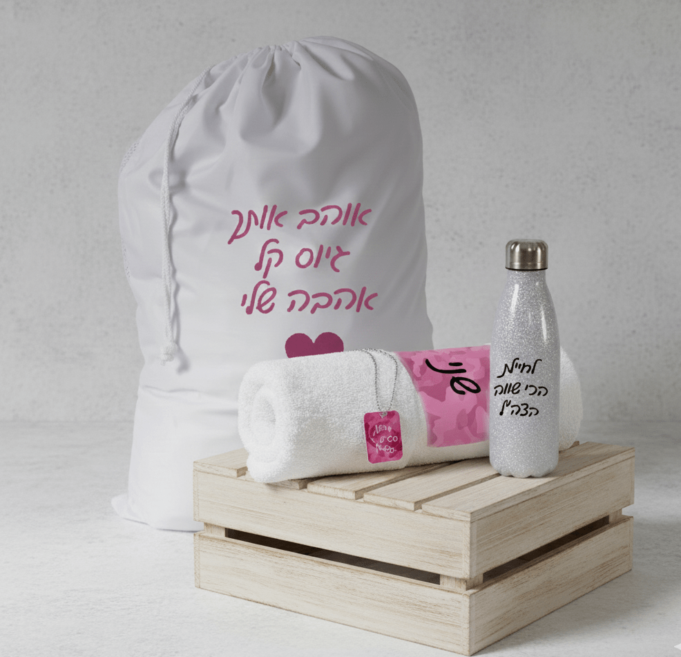 🎁 פינוק מושלם לחיילת עם 20% הנחה! 🎁 סט מתנה חווייתי במיוחד: שק כביסה דרייפיט (50x70) 🧺, מגבת רכה (130x70) 🎀, דיסקית מעוצבת אישית 🚀 ובקבוק תרמי איכותי 💧. הוסיפו לסל 🛒 - ההנחה כבר בפנים! מלאו פרטים וזה בדרך תוך 3-4 ימים 🚚. לאיסוף עצמי: 050-2877977 🚗.